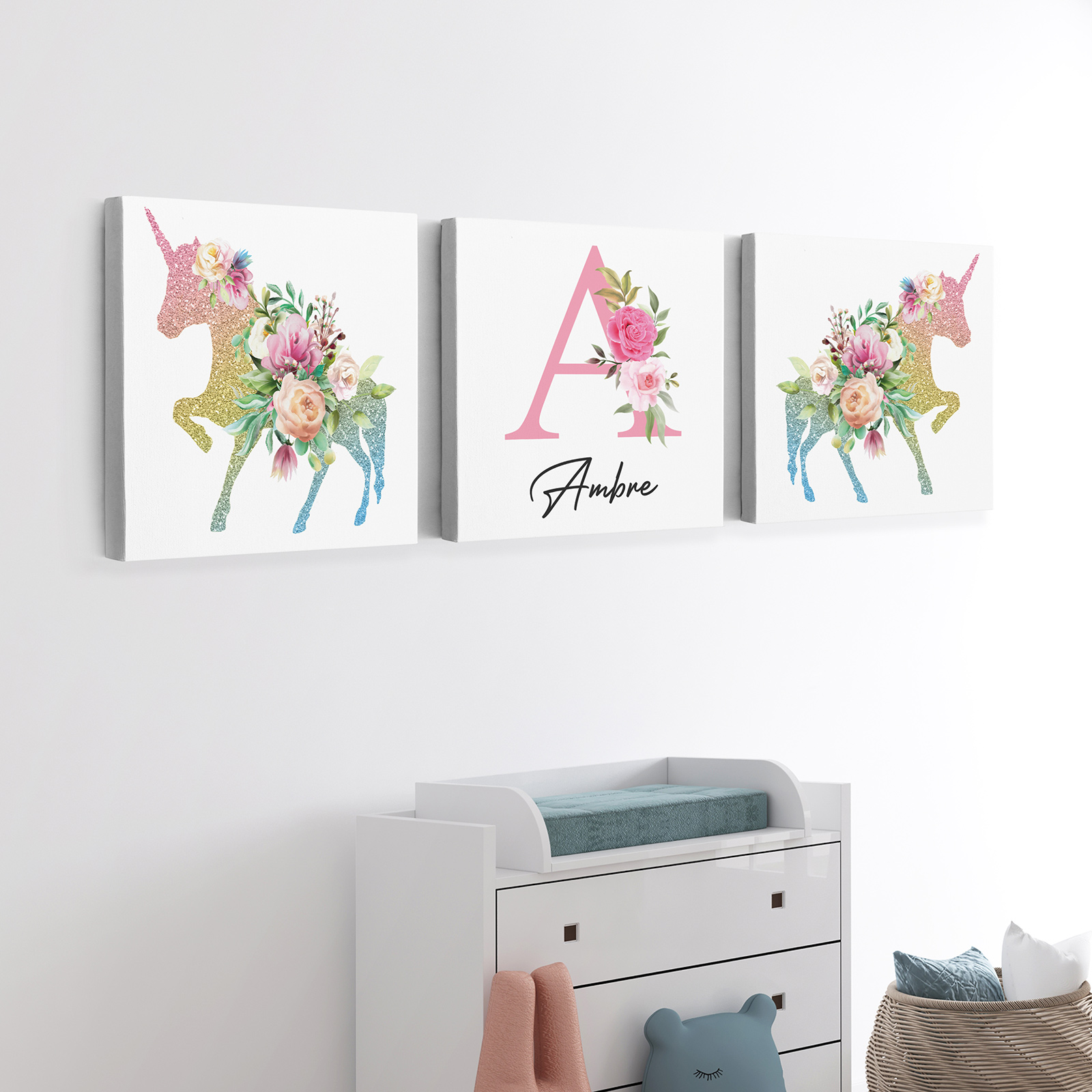 Cuadro trÃptico personalizado para niños - Infantil - Unicornios Flores