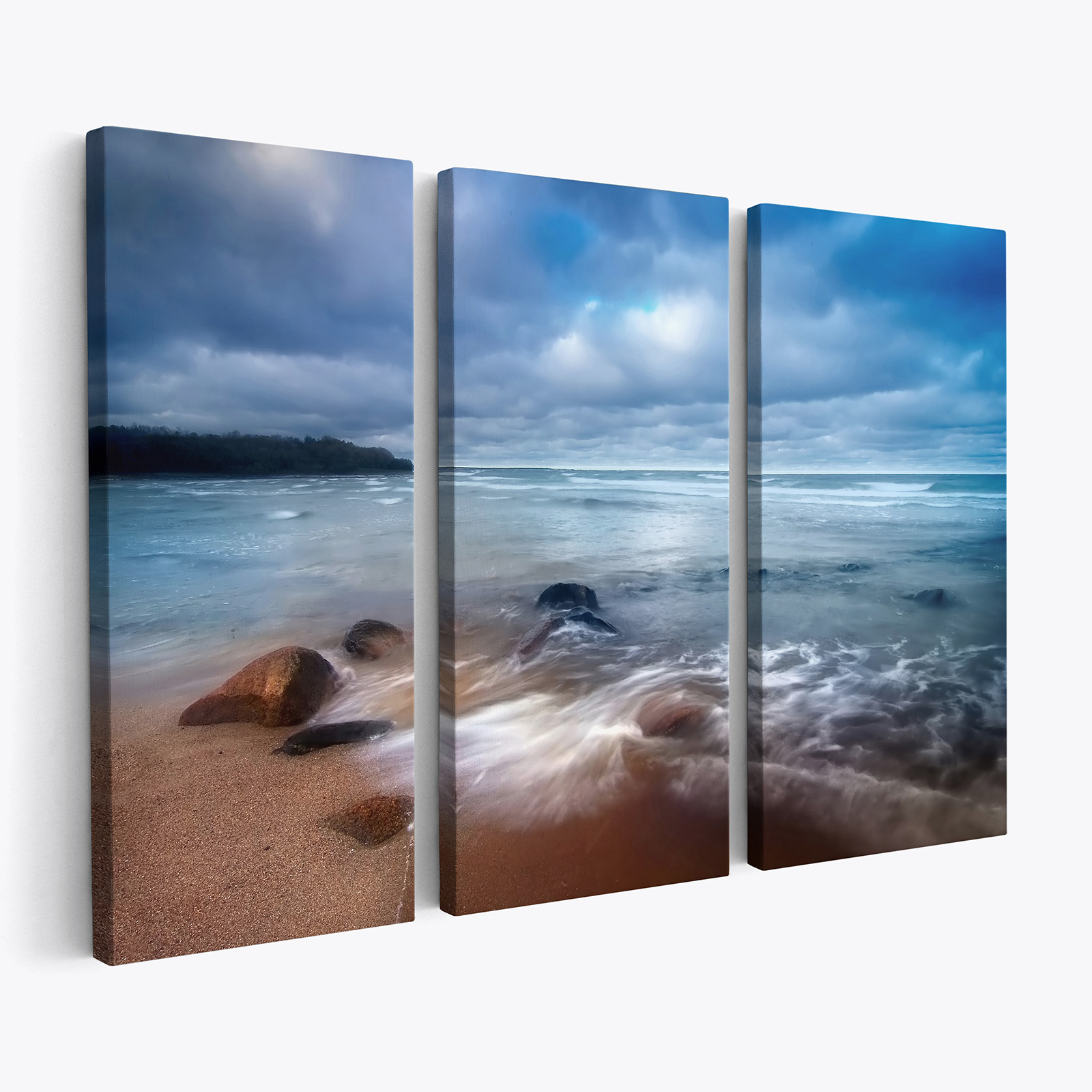 Trípticos de lienzos impresos en alta definición, montados en bastidores de pino de 2 cm de grosor con clavijas de retención.