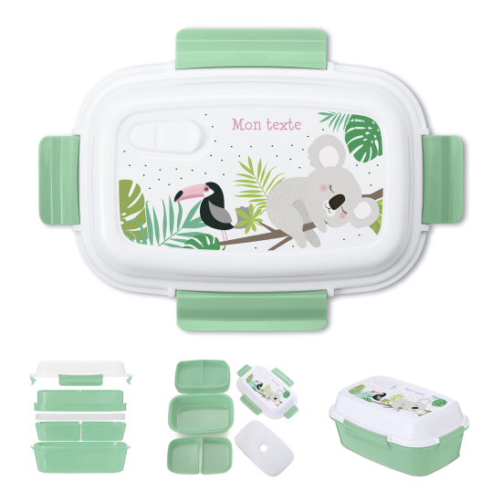 Con una capacidad de 1000 ml, estas cajas de almuerzo personalizadas están divididas en tres compartimentos modulables y vienen equipadas con un bloque de hielo removible para mantener los alimentos frescos. Su tapa hermética puede ser personalizada con un encantador diseño y el nombre de su hijo/a.