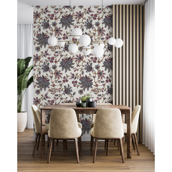 El papel pintado es satinado, sin tejer y ligeramente estructurado.