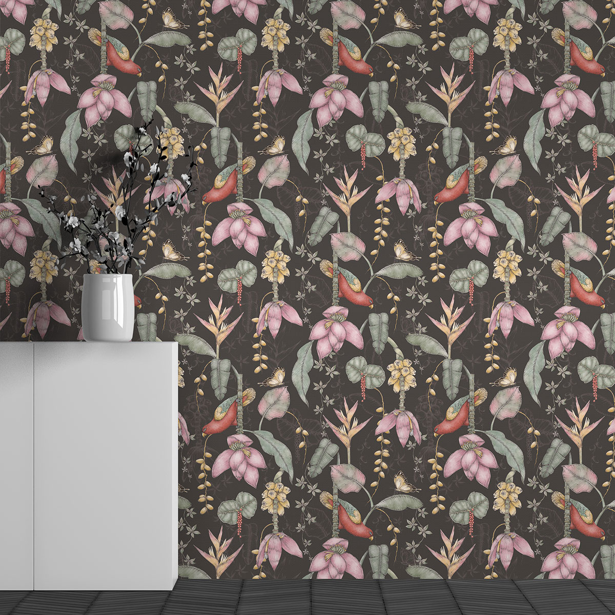 El papel pintado es satinado, sin tejer y ligeramente estructurado.
