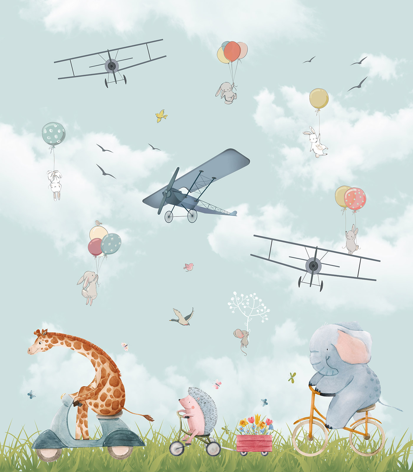 Papel pintado panorámico para niños - Infantil - Animales Aviones