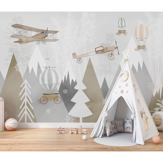Papel pintado panorámico para niños - Infantil - Aviones Globos Aerostáticos