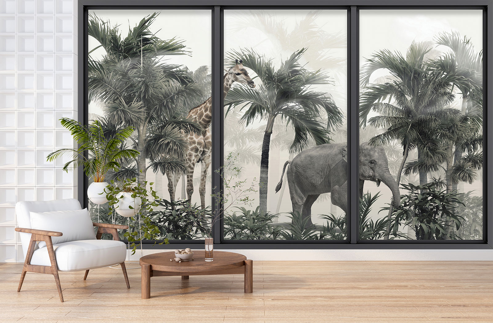 www.lumalea.es > Papeles Pintados > > > Papeles Pintados Trampantojo 3D > Ventanas Panorámicas Trampantojo 3D > Papel pintado panorámico trampantojo - Animales de la jungla