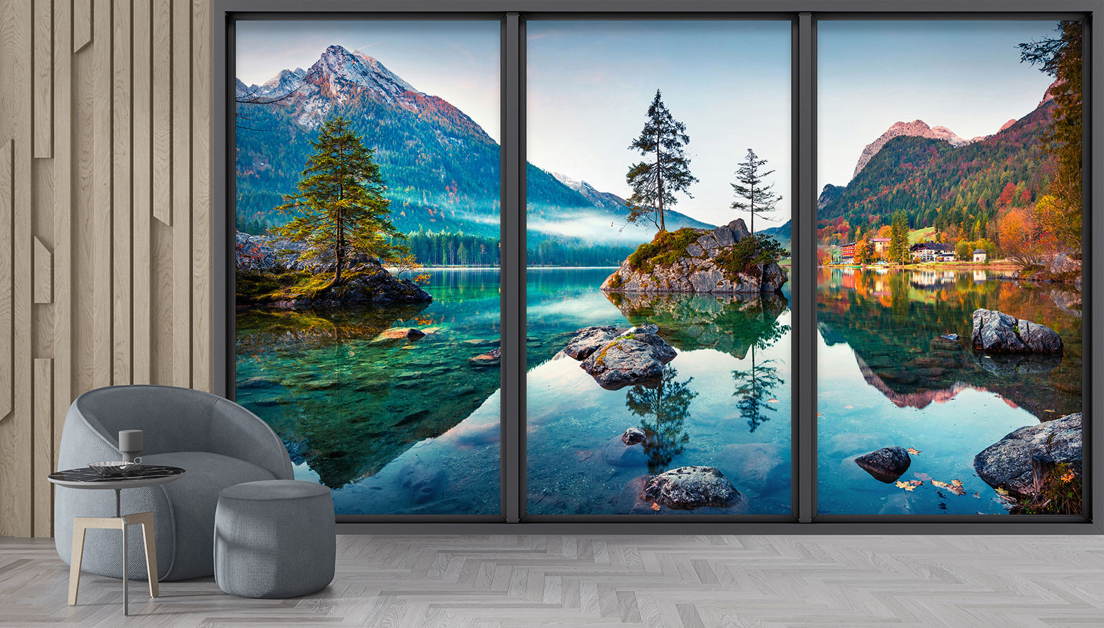 www.lumalea.es > Papeles Pintados > > > Papeles Pintados Trampantojo 3D > Ventanas Panorámicas Trampantojo 3D > Papel pintado panorámico trampantojo - Lago y montañas