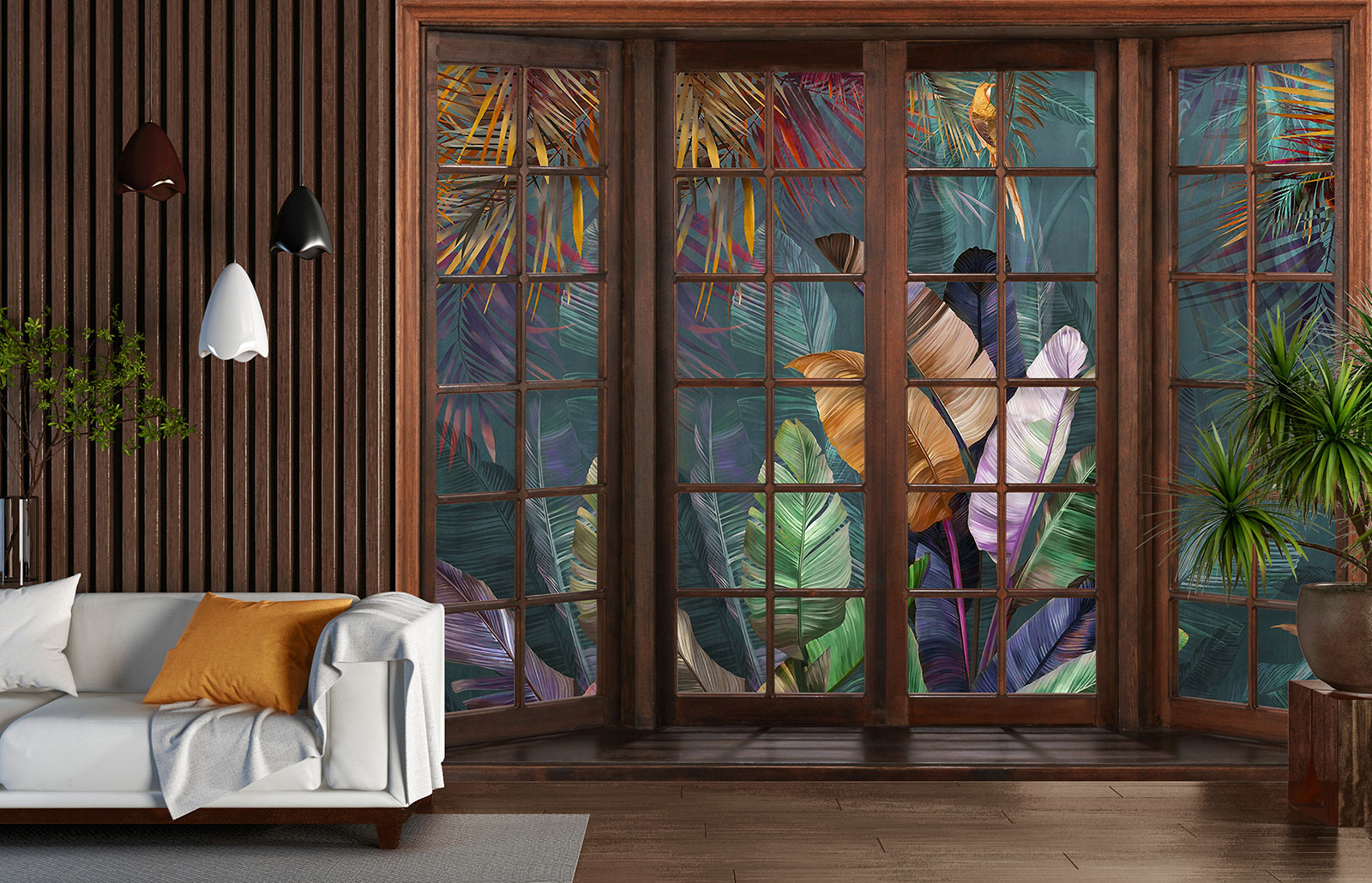 www.lumalea.es > Papeles Pintados > > > Papeles Pintados Trampantojo 3D > Ventanas Trampantojo 3D > Papel pintado panorámico trampantojo - Plantas tropicales