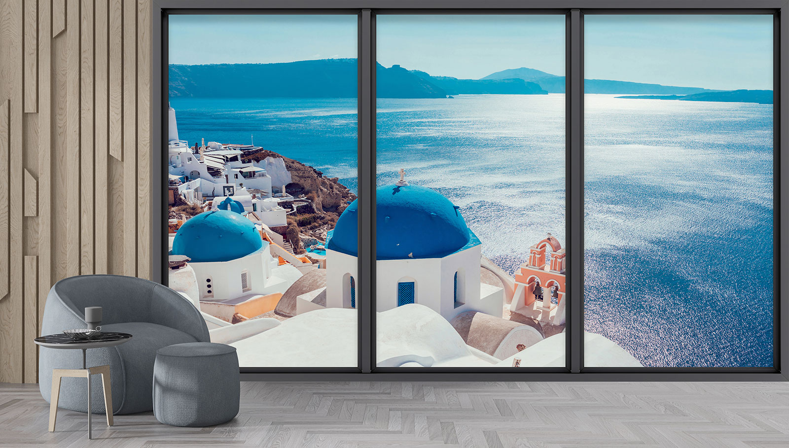 www.lumalea.es > Papeles Pintados > > > Papeles Pintados Trampantojo 3D > Ventanas Panorámicas Trampantojo 3D > Papel pintado panorámico trampantojo - Santorini