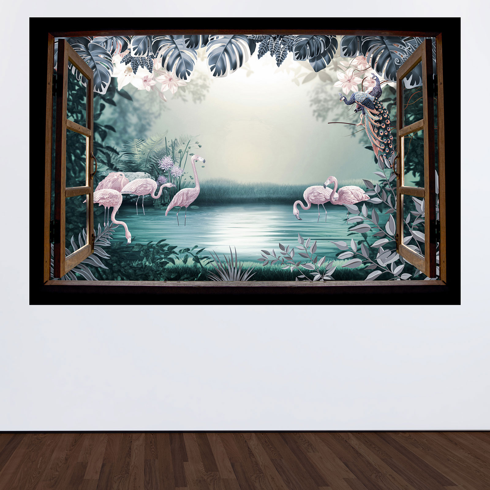 www.lumalea.es > Vinilos > Vinilos Decorativos Trampantojo 3D > Vinilos Decorativos Ventanas de Madera > Vinilo Adhesivo Decorativo trampantojo 3D - Flamencos rosas