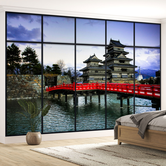 Papel pintado panorámico trampantojo - Templo vista monte Fuji