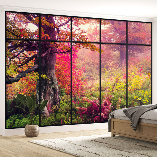 Papel pintado panorámico trampantojo - Árboles hojas rojas